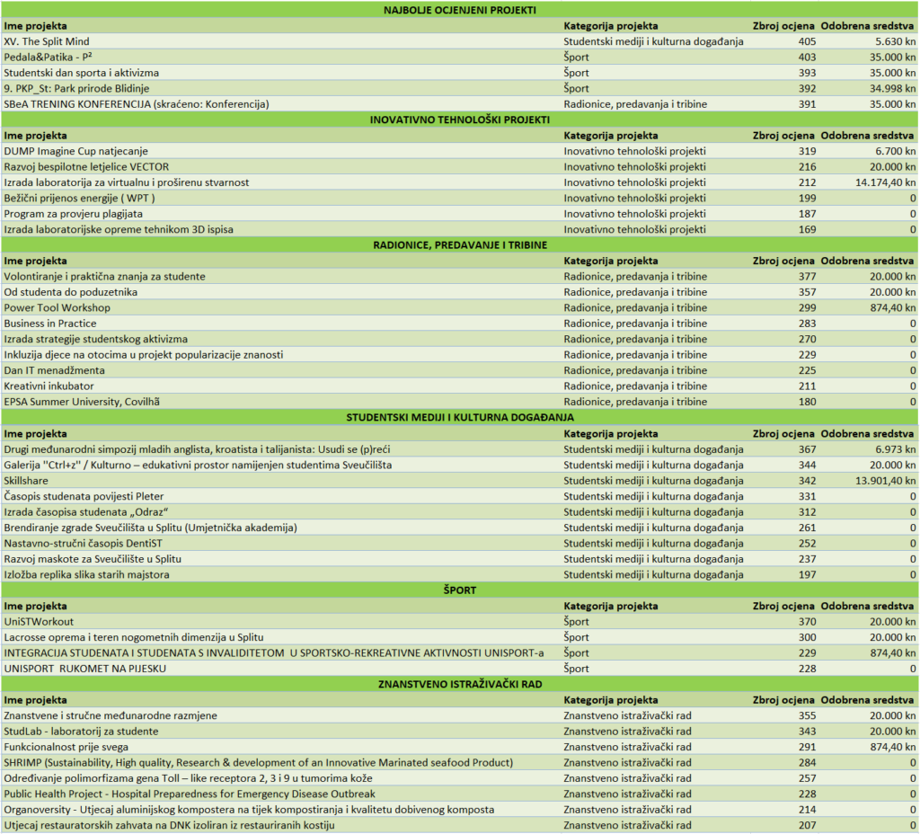 Sukladno članku 4. stavka (10) Pravilnika o postupku provedbe natječaja za studentske programe Studentskog zbora Sveučilišta u Splitu, na sjednici Senata dana 29. lipnja 2017. godine Senat je usvojio sljedeći prijedlog raspodjele sredstava (350 000,00 kuna) natječaja od proračuna Studentskog zbora Sveučilišta u Splitu: